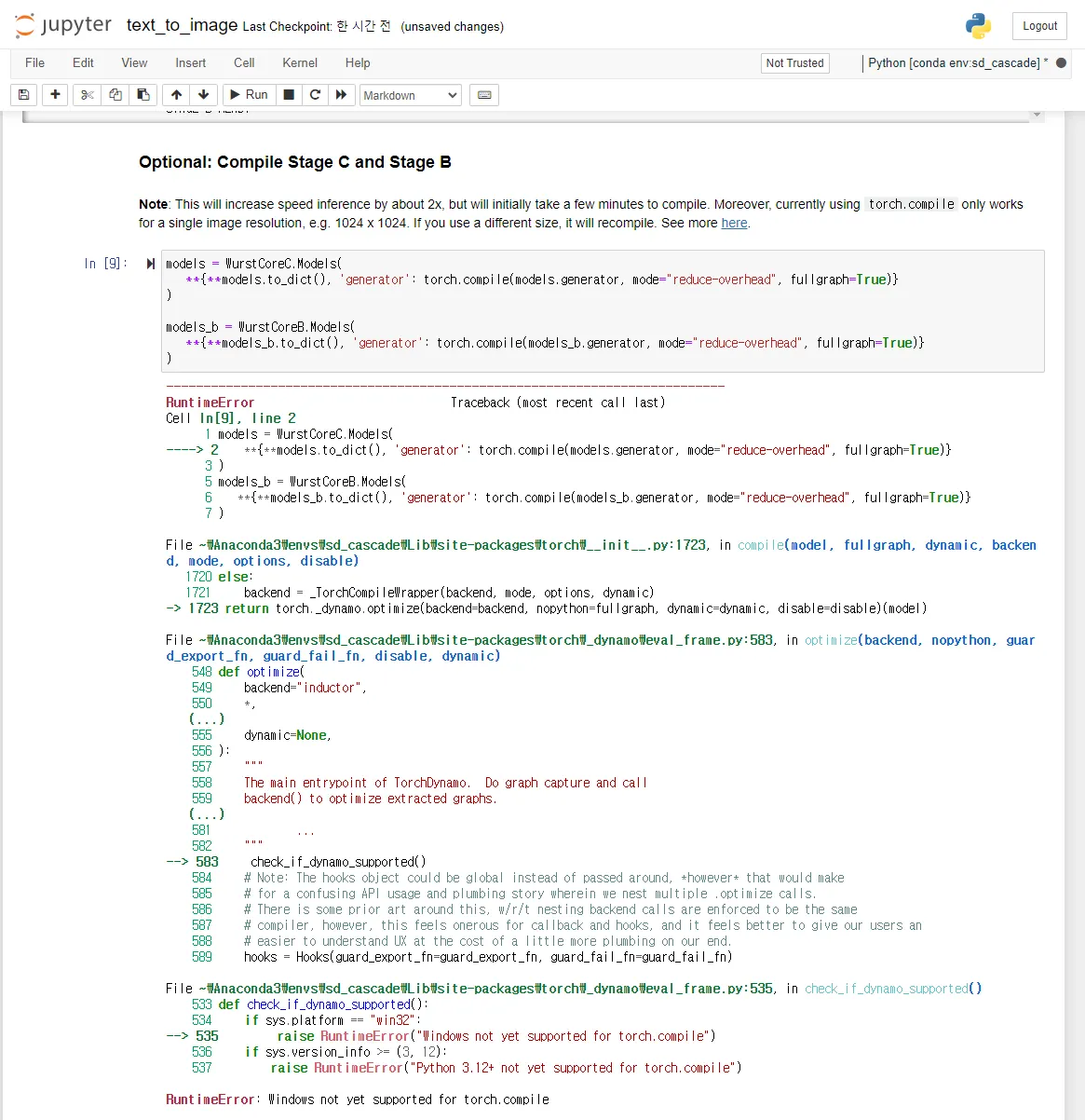 t2i 예제에서 속도를 위한 torch.compile 부분은 윈도우에서 문제가 있음.