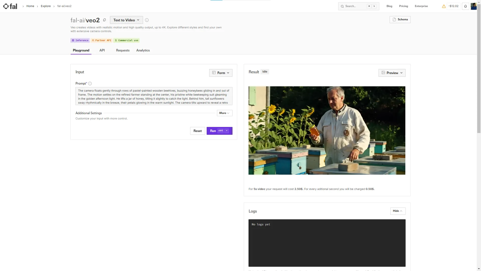 fal ai에서 veo2에 text-to-video를 통해서 비디오를 생성하는 프롬프트를 넣는 텍스트필드는 아래와 같습니다.