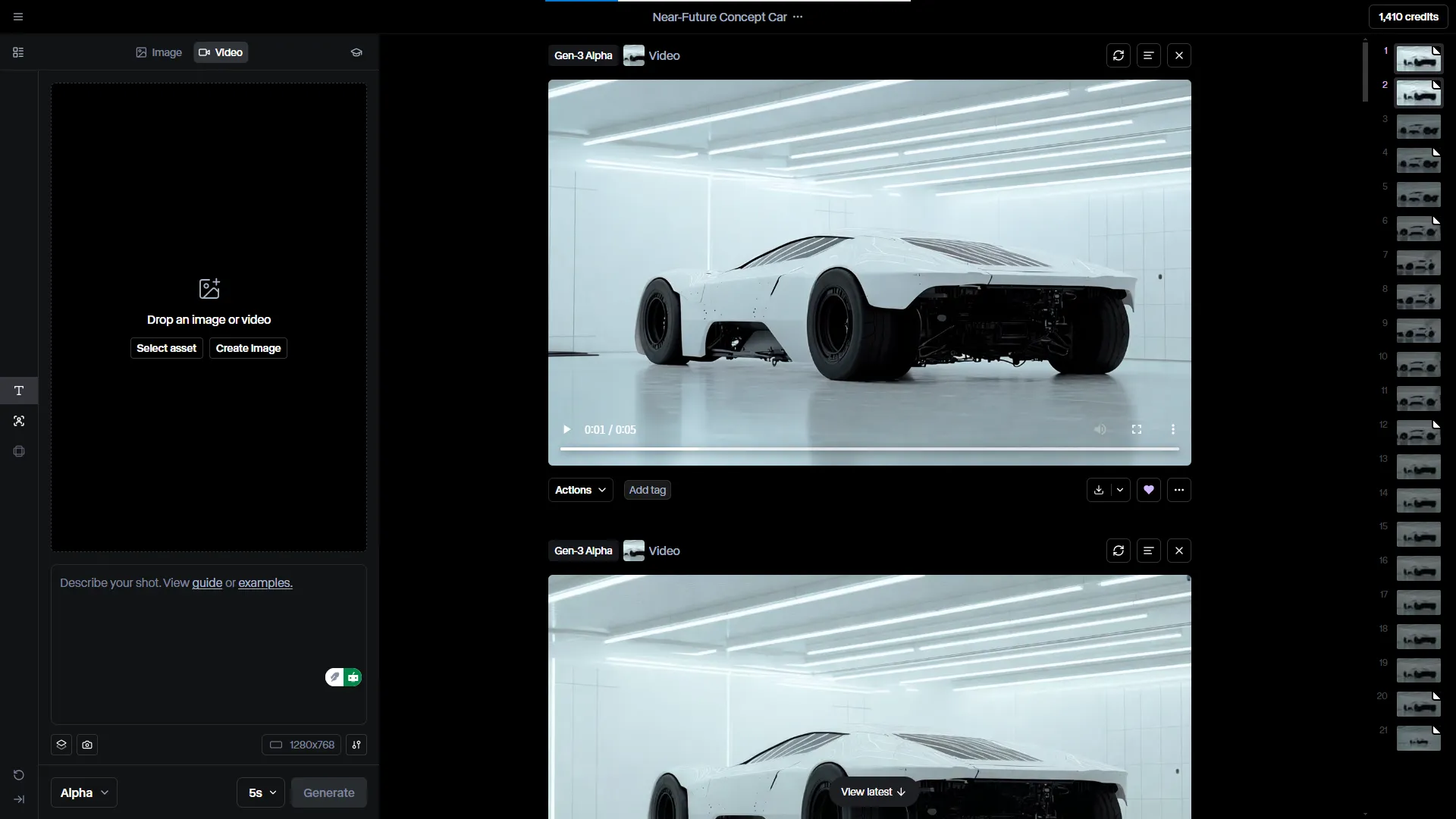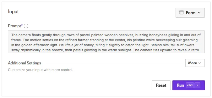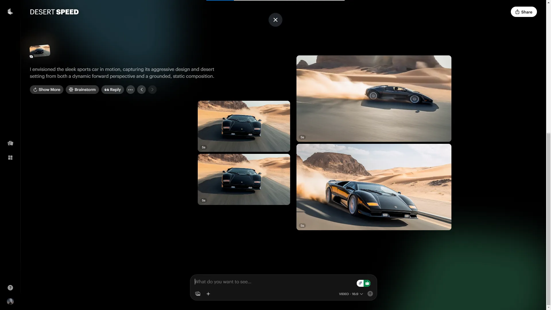 실제적으로 Text-to-Video를 실행시키기 위한 것은 하단의 텍스트 프롬프트창에서 이루어집니다. 여기에 있는 텍스트 필드에 생성하고자 하는 영상을 설명하는 프롬프트를 입력하고 몇가지 옵션들을 생성하고자 하는 영상에 맞춰서 선택한다음 실행 버튼을 누르는 것이 Text-to-Video를 하기위한 전부입니다. 대부분의 다른 플랫폼들도 비슷한 UI를 가지고 있습니다. 현재로서는 LumaAI Dream Machine 정도가 시스템과 대화하는 인터랙티브한 경험을 제공하고 있습니다.