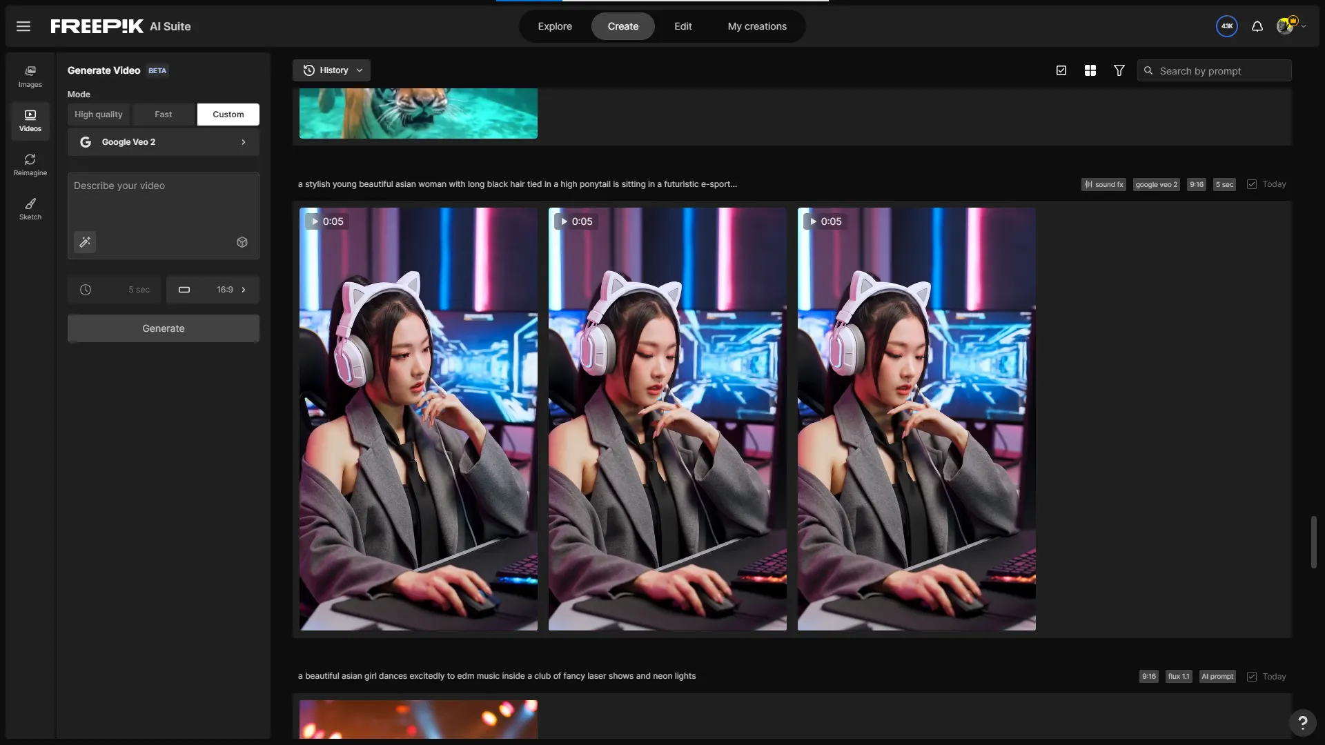 Freepik에서도 좌측 사이드바에 비디오를 생성하기 위한 옵션들이 있습니다. 실제로 서비스하는 플랫폼이 아니다보니 최소한의 기능만 제공되고 있습니다. 비디오를 생성하기 위한 텍스트 필드는 아래와 같은 모습입니다.