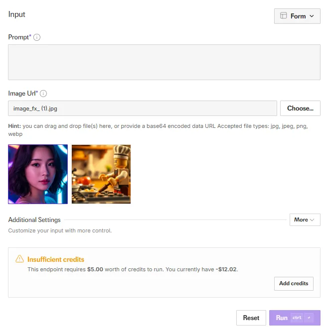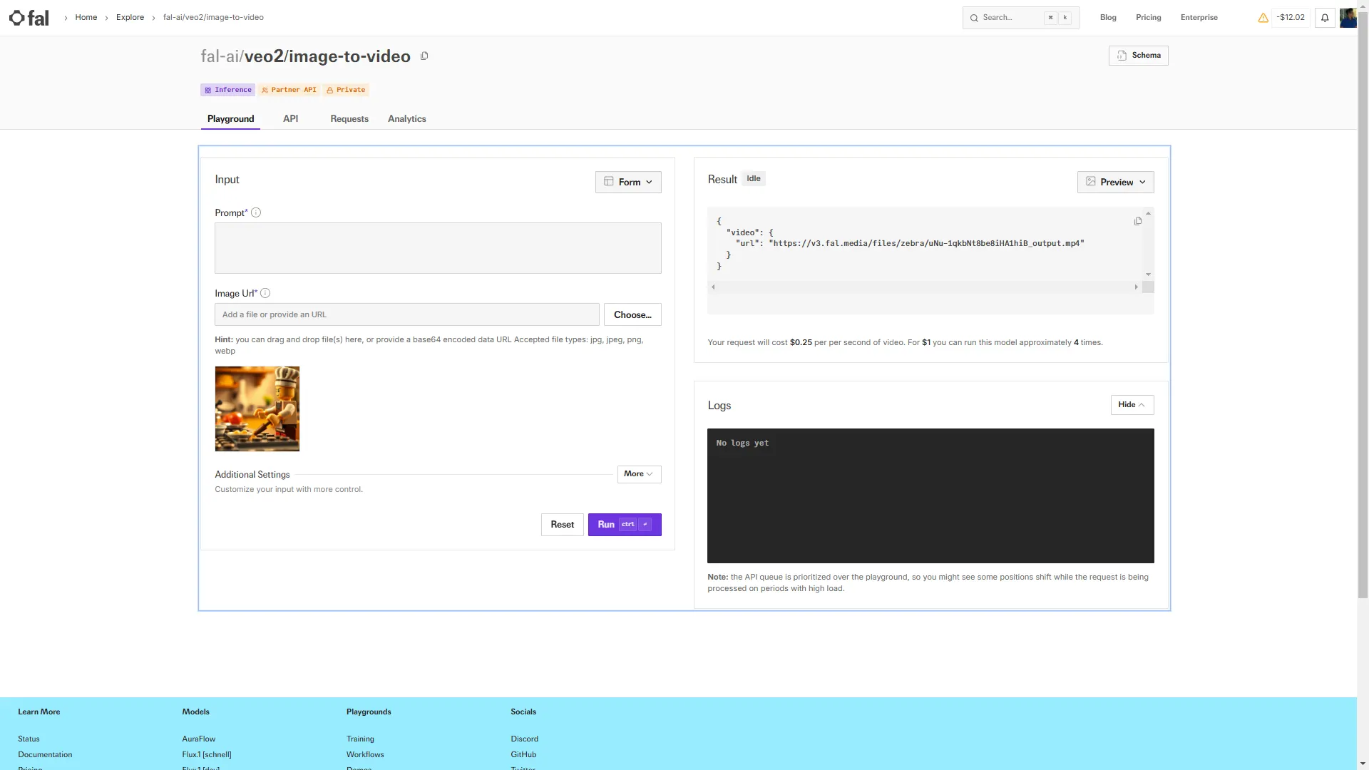 사용법은 간단합니다. 준비된 이미지를 Image Url에 등록 해주면 됩니다. 프롬프트는 Prompt 텍스트 필드에 입력하면 됩니다. 기본적으로 프롬프트 없이 이미지 프롬프트 만으로 영상을 생성하도록 하겠습니다. Freepik에서는 최대 5초 생성이 가능한 반번 Fal.ai에서는 최대 8초로 영상을 생성할 수 있습니다.