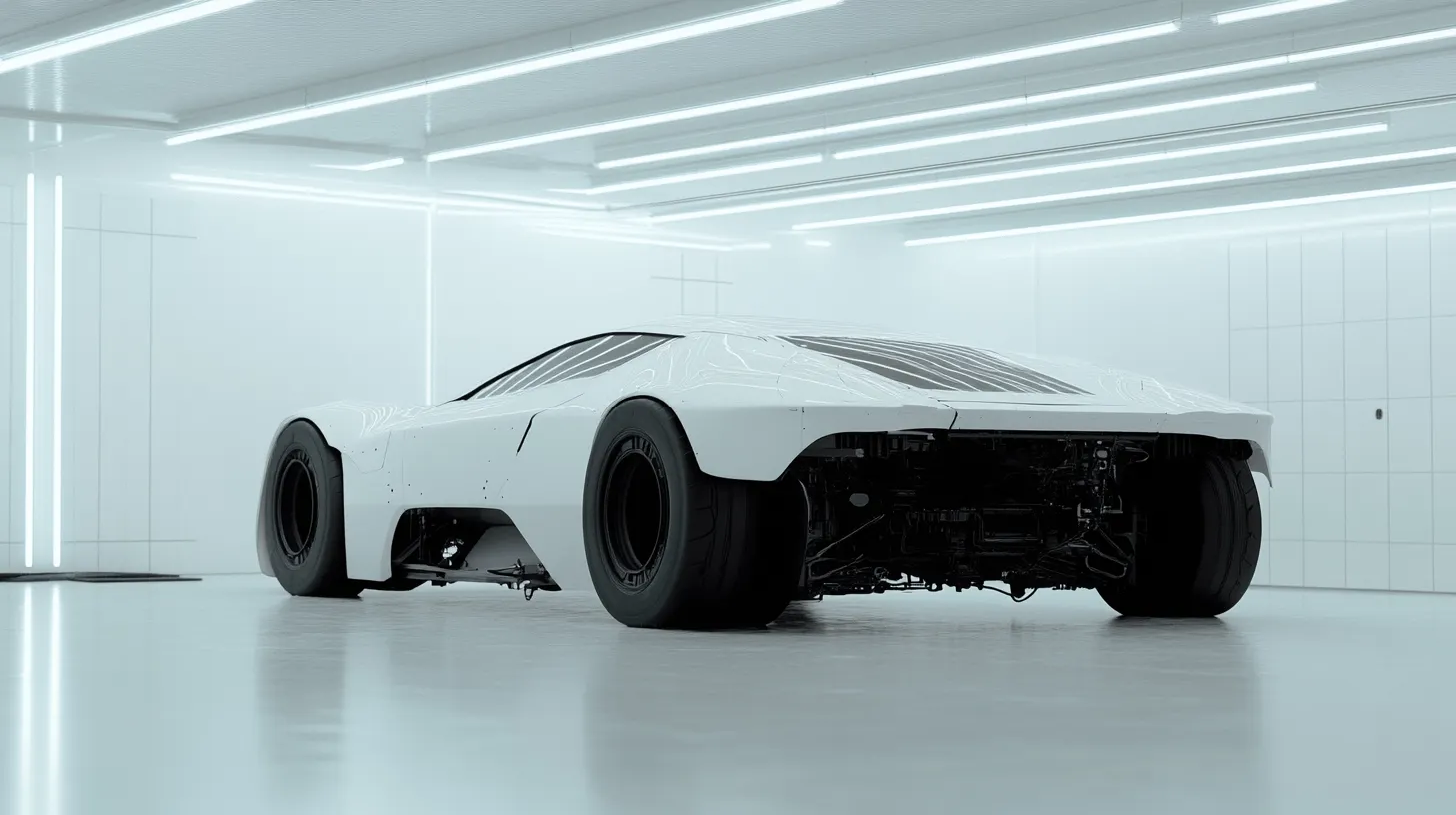 A near-future concept car with a straight line and a variety of mechanical components is in a garage with a minimal design of white walls.