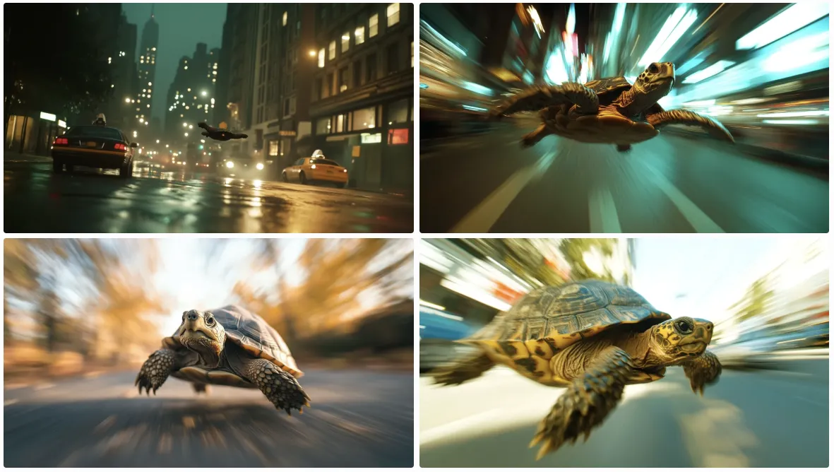 아래의 이미지들은 LumaAI의 Image-to-Video를 위한 인풋 이미지로 Midjourney에서 만든 빠르게 도심을 질주하는 거북이의 역동적인 모습을 표현한 이미지 입니다. 일반적으로 느리고 조용한 존재로 인식되는 거북이를 반전된 속도감과 강렬한 연출로 표현하려고 했습니다. 밤의 네온 사인이 반짝이는 도심을 배경으로, 거북이들은 공중을 날며 빛의 궤적을 남기고 Snorricam 기법을 활용해 카메라가 거북이에 고정된 듯한 시점을 유지하며, 거북이의 움직임을 따라가는 생생한 장면을 연출하도록 유도했습니다. 그리고 이 아이디어는 책을 쓰기 위해서 예시 이미지를 만드는 것을 보고 있던 이제 초등학교 4학년이 되는 둘째 아들이 준 아이디어로 부터 출발 했습니다.