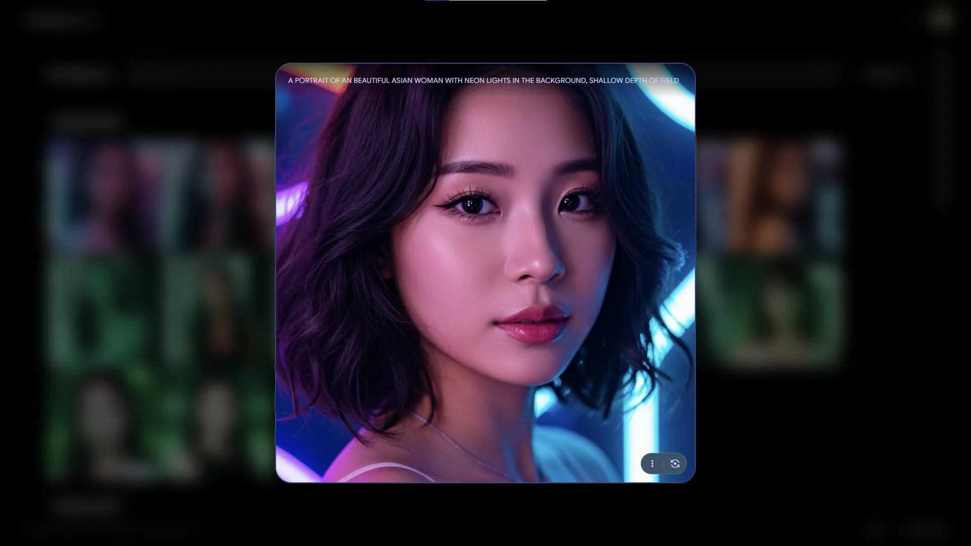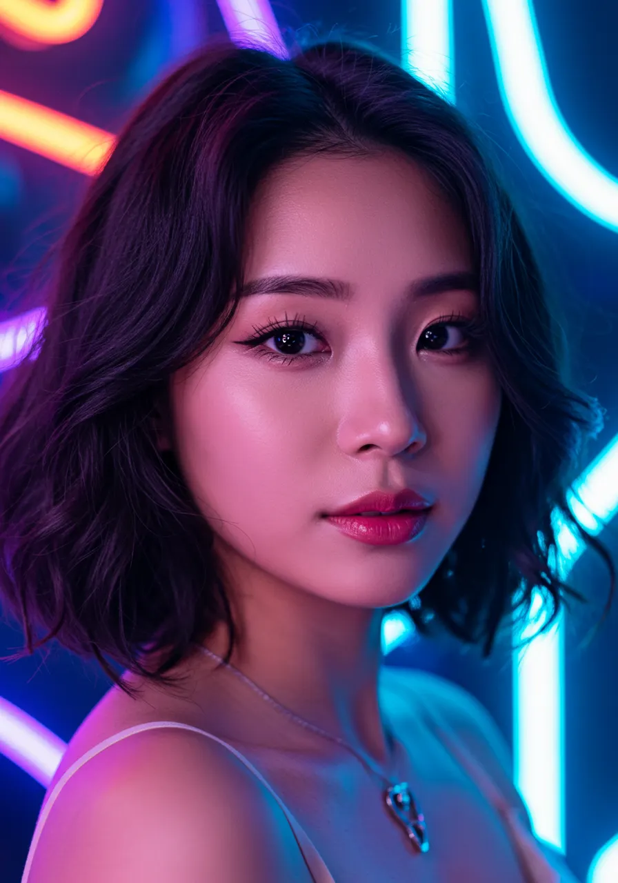 A portrait of an beautiful Asian woman with neon lights in the background, shallow depth of field