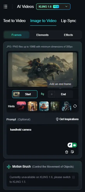 Kling AI의 사이드바에서 Image to Video 탭을 선택하고 Frames 탭에서 Start 프레임에 선택한 이미지를 업로드 합니다. 영상을 좀 더 역동적으로 표현하기 위해서 Handheld같은 촬영 용어를 프롬프트에 입력했습니다.