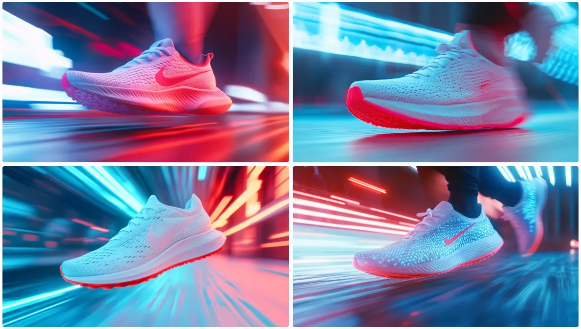 ‘역동적(dynamic) 촬영’과 ‘미래지향적(futuristic) 러닝화’를 결합해, 제품이 속도감 있고 첨단 기술을 반영한 분위기를 갖도록 지시했습니다. 스니커즈의 혁신성과 퍼포먼스를 부각시키는 핵심 구문입니다.