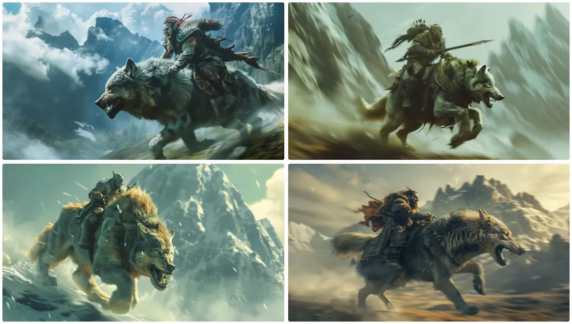 Midjourney에서 Kling AI의 인풋으로 사용할 이미지를 생성 했습니다. 이 이미지들은 판타지 세계의 북방의 산악 지형을 배경으로 거대한 늑대를 타고 돌진하는 오크 전사의 역동성과 세계관을 표현하기 위해 만들어졌습니다. Kling AI에 입력함으로써, 보다 영상적인 판타지 장르의 스토리를 구성하고자 했습니다. 거친 오크 전사와 늑대의 조합은 북유럽풍 판타지 미학을 연상시키며, 다양한 후속 편집을 통해 새로운 시나리오나 스토리텔링 구상에 활용할 수 있을 것입니다.