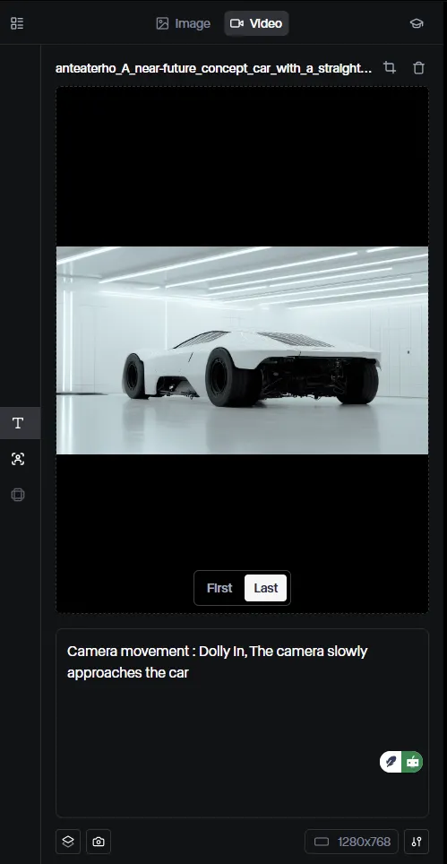 프롬프트로 다른 카메라 워크를 시도해 보도록 하겠습니다. Dolly In으로 카메라를 천천히 자동차 쪽으로 접근 시키도록 했습니다. 그리고 업로드한 인풋 이미지를 Last 프레임으로 사용해서 멀리서부터 카메라가 Dolly In으로 접근해서 인풋 이미지와 같은 구도가 되었을 때 멈추도록 했습니다.