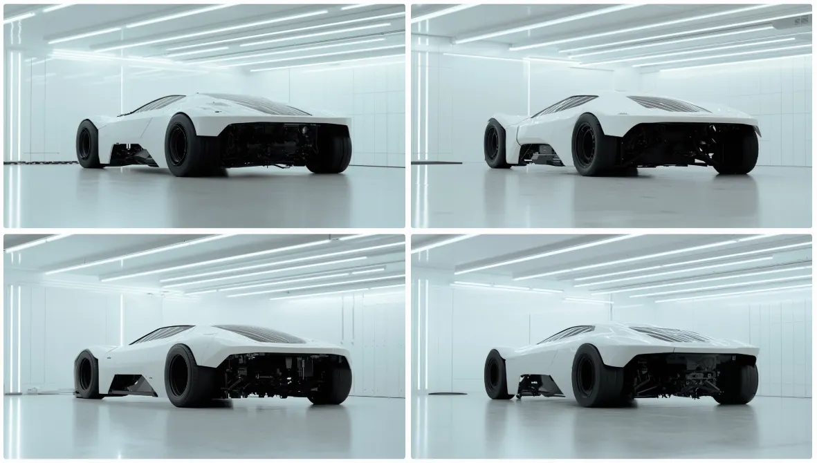 차량이 도로 위가 아닌 실내 공간(차고)에 위치하고 있음을 명확히 설정했습니다. 실험실, 연구소, 하이엔드 디자인 스튜디오 같은 고급스러운 배경이 연상 되도록 했습니다.