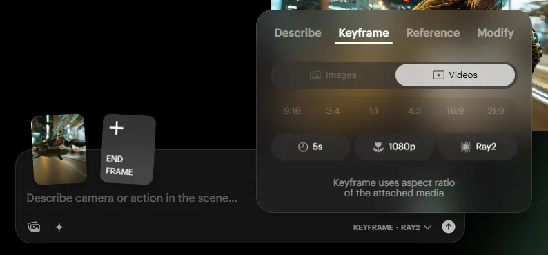 Dream Machine에서 Ray2를 선택하려면 아래의 이미지와 같이 설정에서 Ray2를 선택해야 합니다. 새로운 모델로 업데이트가 된 후로 기본으로 Ray2가 선택되어 있지만 End Frame을 선택하면 이전 모델인 Ray 1.6으로 전환됩니다. Ray2가 공식적으로 발표가 되면서 그동안의 Dream Machine의 비디오 생성 모델이 Ray 1.6인 것으로 밝혀졌습니다. 현재(2025.02.23)기준으로 얼마 전에서야 Ray2에서 Image-to-Video 기능이 지원 되었습니다, 하지만 아직 제대로 된 Keyframe은 안 되고 있습니다. 하지만 빠른 시일에 지원될 것이라 유추 됩니다.