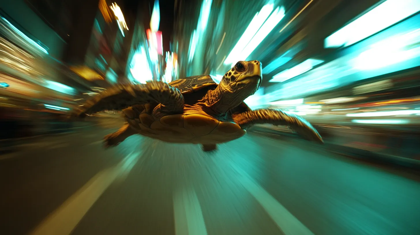 A high-speed flying tortoise racing through a neon-lit city at night, Snorricam perspective, wide-angle shot