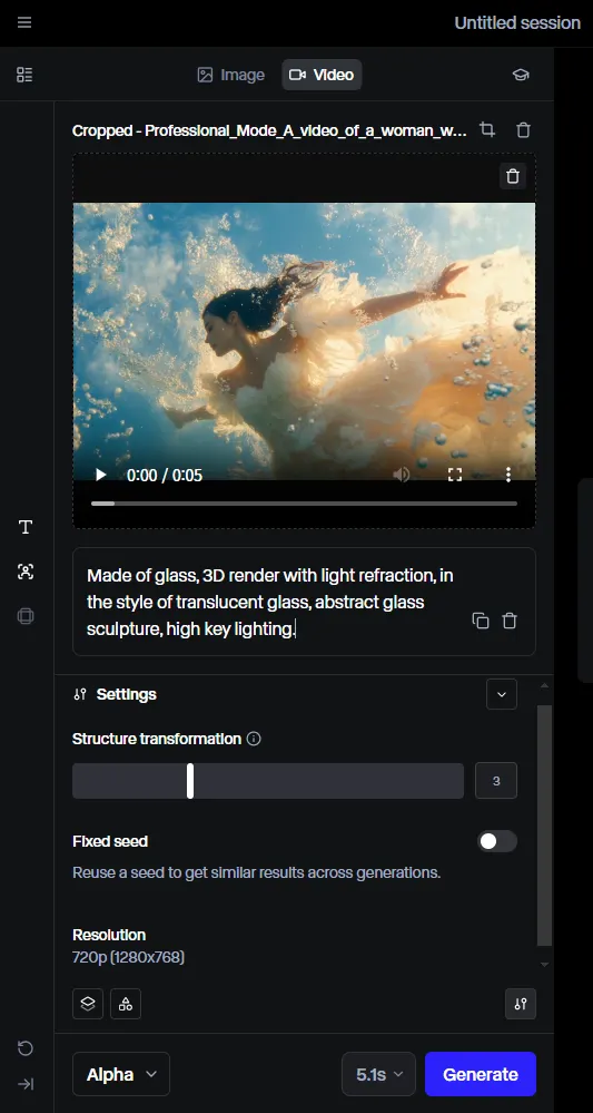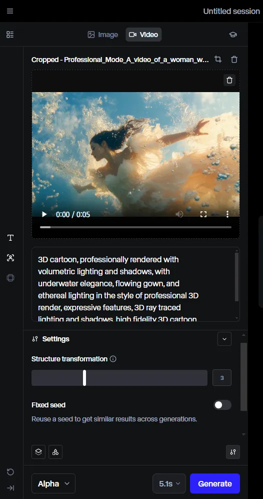 변환하고자 하는 영상을 업로드한 후, 원하는 스타일이나 분위기를 설명하는 텍스트 프롬프트를 입력하여 영상을 재구성할 수 있습니다. 예를 들어, "수채화 그림 스타일" 또는 "사이버펑크 도시 배경"과 같은 프롬프트를 통해 다양한 시각적 변화를 줄 수 있습니다. Sora의 Remix Strength와 마찬가지로 구조 변환 슬라이더(Structure Transformation Slider)를 통해 원본 영상의 구조를 얼마나 유지할지 조절할 수 있습니다. 낮은 값은 원본 영상의 구조를 더 많이 유지하며, 높은 값은 원본 영상에서 더 벗어난 창의적인 변환을 가능하게 합니다. 고정 시드에 대해서는 생성 이미지 및 영상에서 기본적인 사항이기 때문에 따로 설명은 생략하겠습니다.