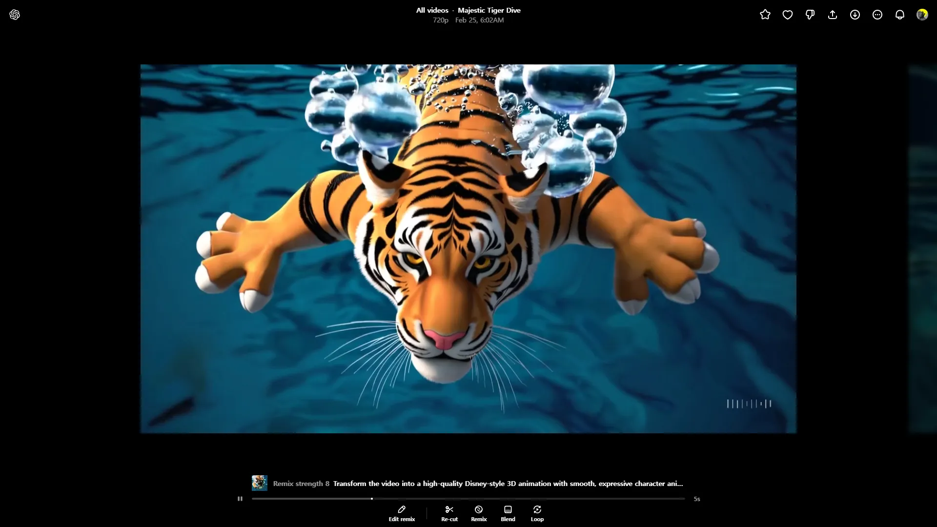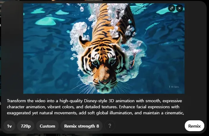 아래의 이미지는 기존에 생성했던 수영장에 다이빙하는 호랑이의 수중 영상 입니다. 이 영상을 디즈니 스타일의 3D 애니메이션 스타일로 변환하도록 하겠습니다. 프롬프트는 이미지의 하단과 같이 작성했습니다.