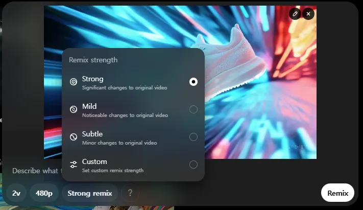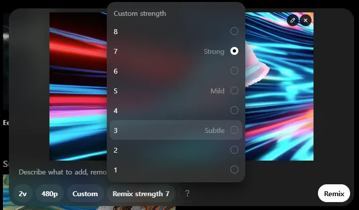 Remix의 강도를 설정할 수 있습니다. Strong, Mild, Subtle, Custom등의 강도를 제공하고 있습니다. 기본 설정은 Strong입니다.