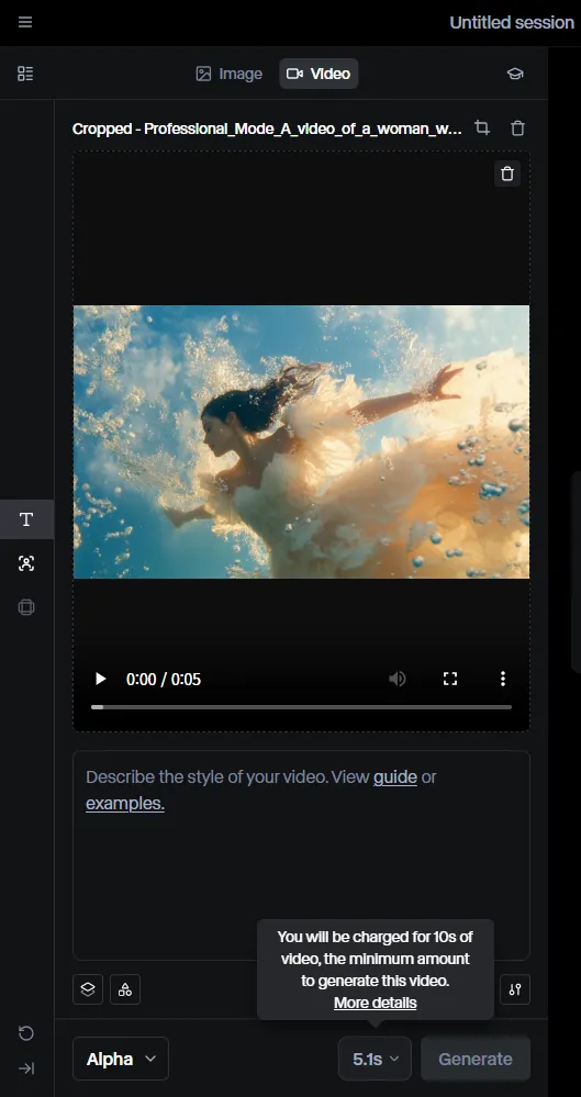 1280 x 768에 맞게 영상이 크롭 되었습니다. 그리고 이 비디오를 생성하는 최소 금액인 10초 분량의 비디오에 대해 요금이 부과되는 것에 대한 알림이 나타납니다.