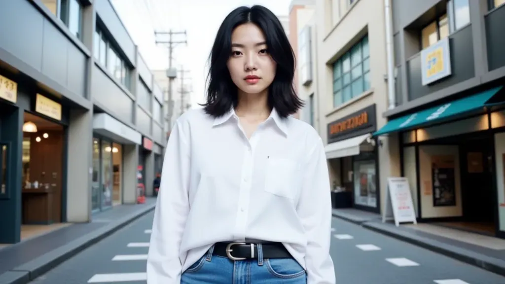 A young Asian woman kys, standing, white button-up shirt, blue jeans, black belt, minimalistic outfit, urban street, modern city, storefronts, contemporary architecture, soft natural lighting, confident expression, cinematic shot, street fashion.