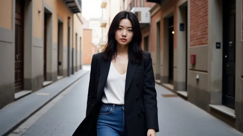 A young Asian woman kys, walking, stylish outfit, black double-breasted blazer, white v-neck top, blue slim-fit jeans, modern city street, European-style buildings, urban alley, confident expression, natural lighting, street fashion, cinematic shot.