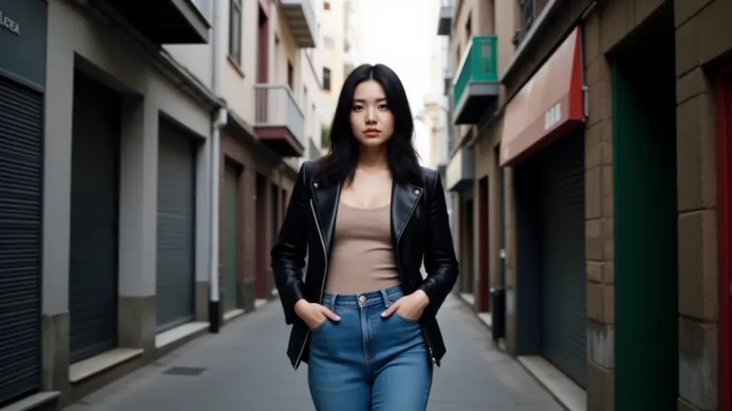 A young Asian woman kys, black leather jacket, beige tank top, blue slim-fit jeans, stylish and confident, urban alley, European-style buildings, closed storefronts, soft natural lighting, street fashion, cinematic shot