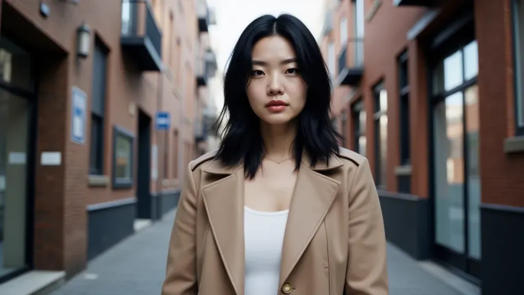 A young Asian woman kys, standing, beige trench coat, white tank top, natural wavy hair, stylish and confident, modern urban alley, brick buildings, soft natural lighting, cinematic shot, street fashion, contemporary city vibes