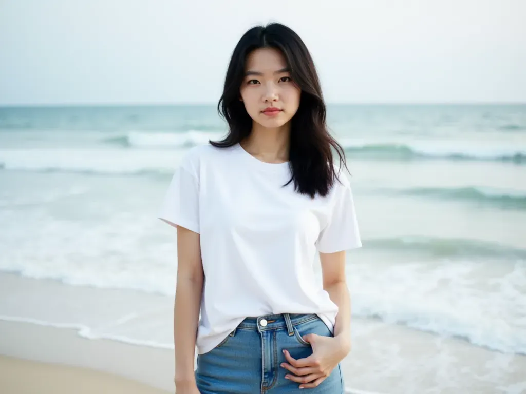 a young Asian woman kys with white t-shirts and blue jean and posing on the beach.