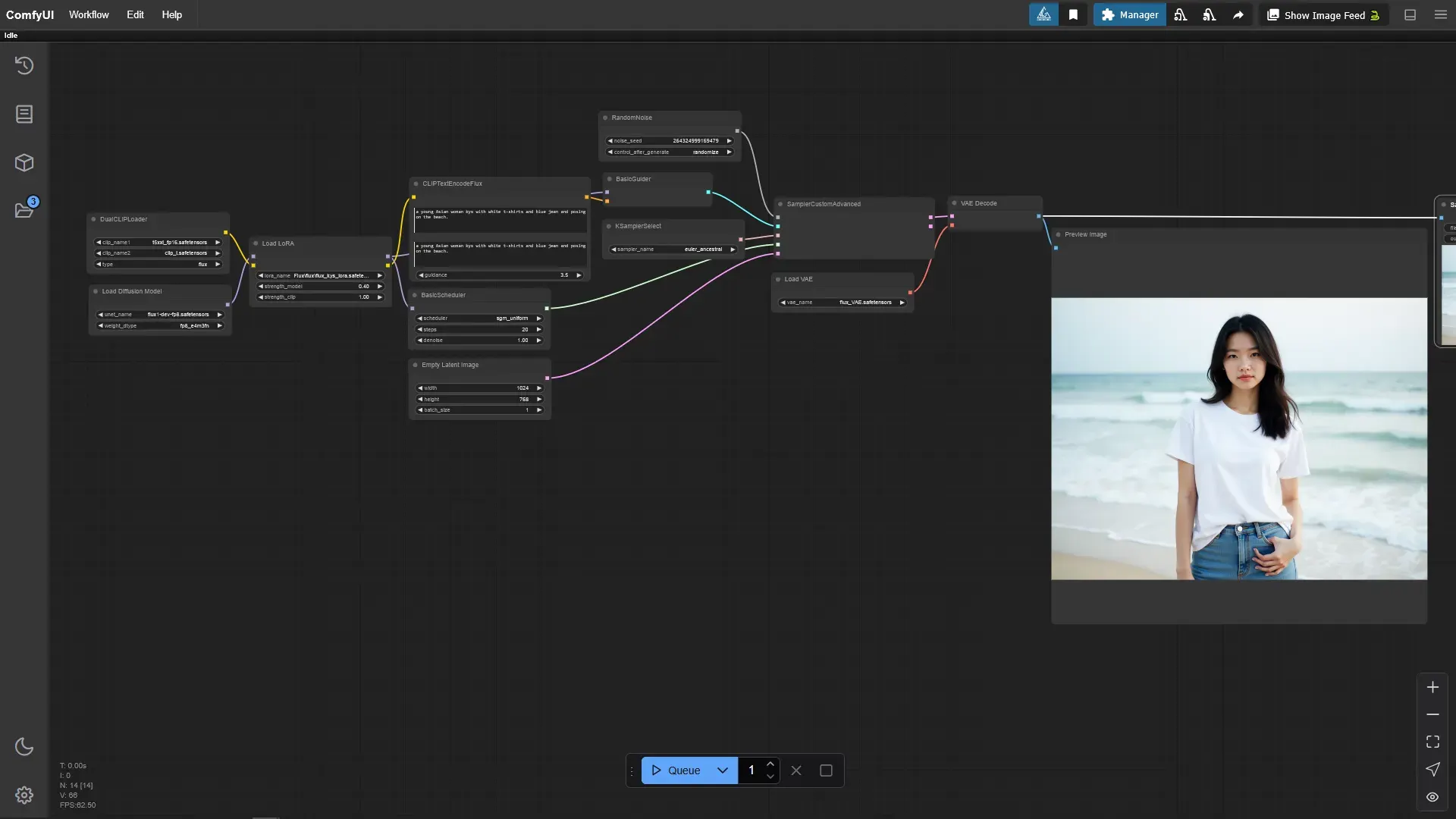 이전 섹션 2-2-2에서 사용했던 ComfyUI 워크플로우에서 Load LoRA노드에서 Fal.ai에서 학습시킨 LoRA를 선택 했습니다. Fal.ai에서 생성한 LoRA의 이름을 flux_kys_lora.safetensors라고 알기 쉽게 이름을 교체 했습니다.
