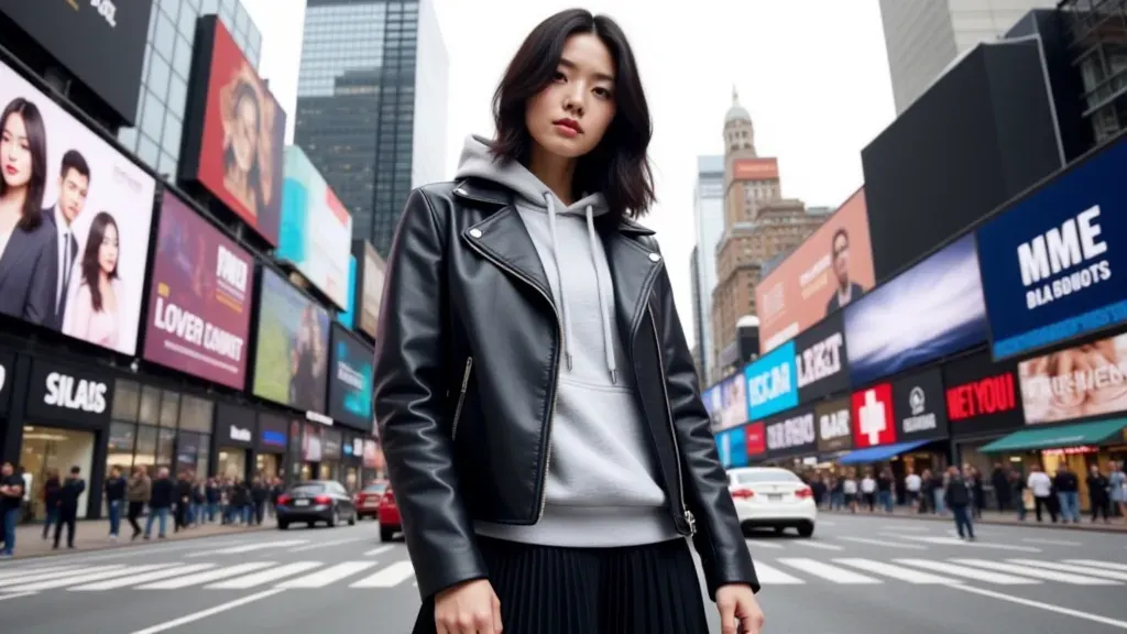 A young Asian woman kys, standing, leather jacket, gray hoodie, pleated black skirt, urban street, busy city, neon billboards, Times Square, digital advertisements, crowd in background, modern fashion, stylish, cinematic shot, street photography.