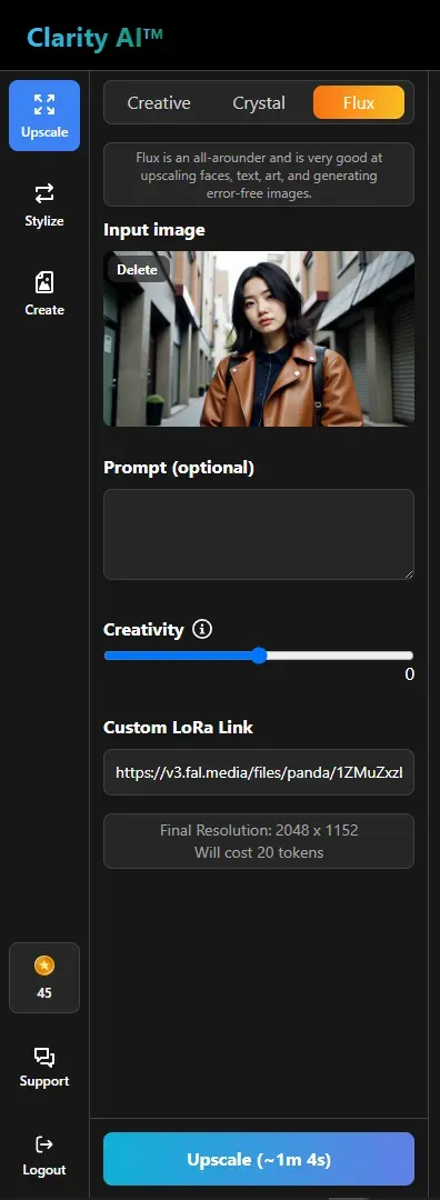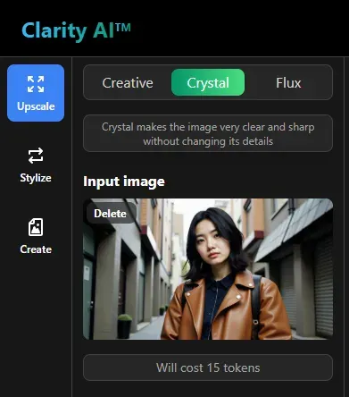 ClarityAI의 경우 Creative, Cristal, Flux 세가지 종류의 업스케일을 지원하고 있습니다.