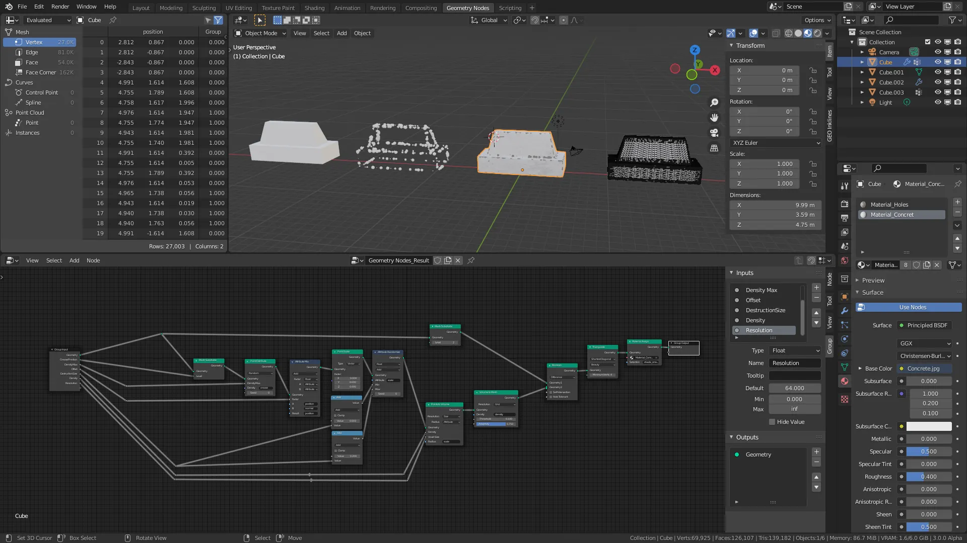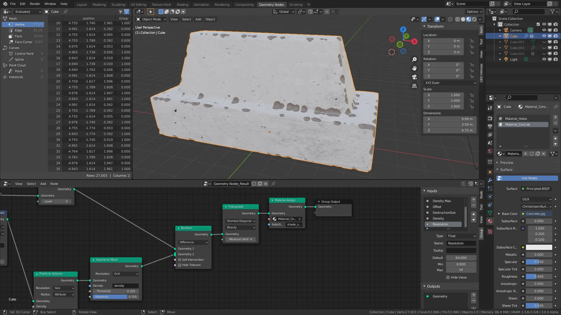 Blean으로 오브젝트를 Difference로 빼고나서 Material Assign노드로 Shade Smooth 속성이 적용된 Face에 콘크리트 재질의 메터리얼을 다시 어싸인 해줍니다.