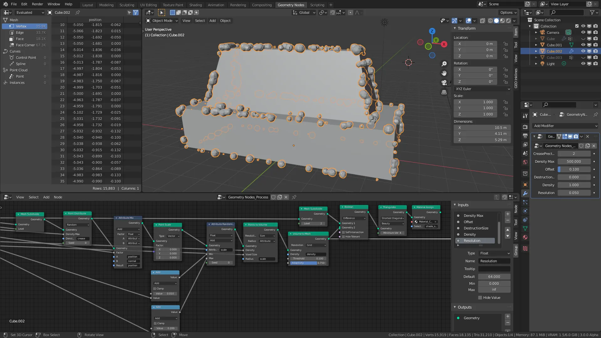 원본 메쉬의 Geometry데이터를 불러와서 Point Distribute로 Geometry의 포인트(Edge Grease)들을 불어와서 Point Volume과 Volume tom Mesh로 서브메쉬를 만들고 그것을 원본에서 Boolean 하는 것입니다.