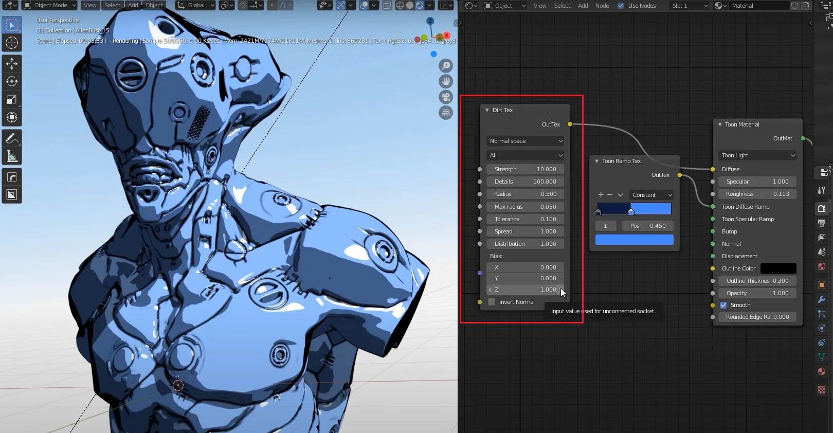 Dirt Tex란 노드를 통해서 가능하다. AO에 대한 기능인 것 같은데 값을 조절하면서 안쪽의 선묘사가 가능해지는 듯 합니다.