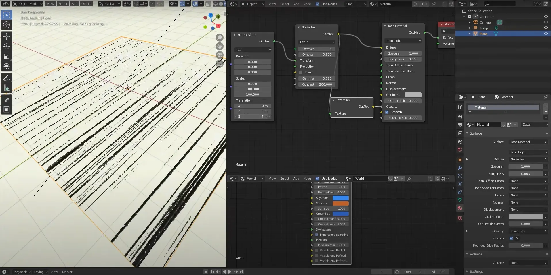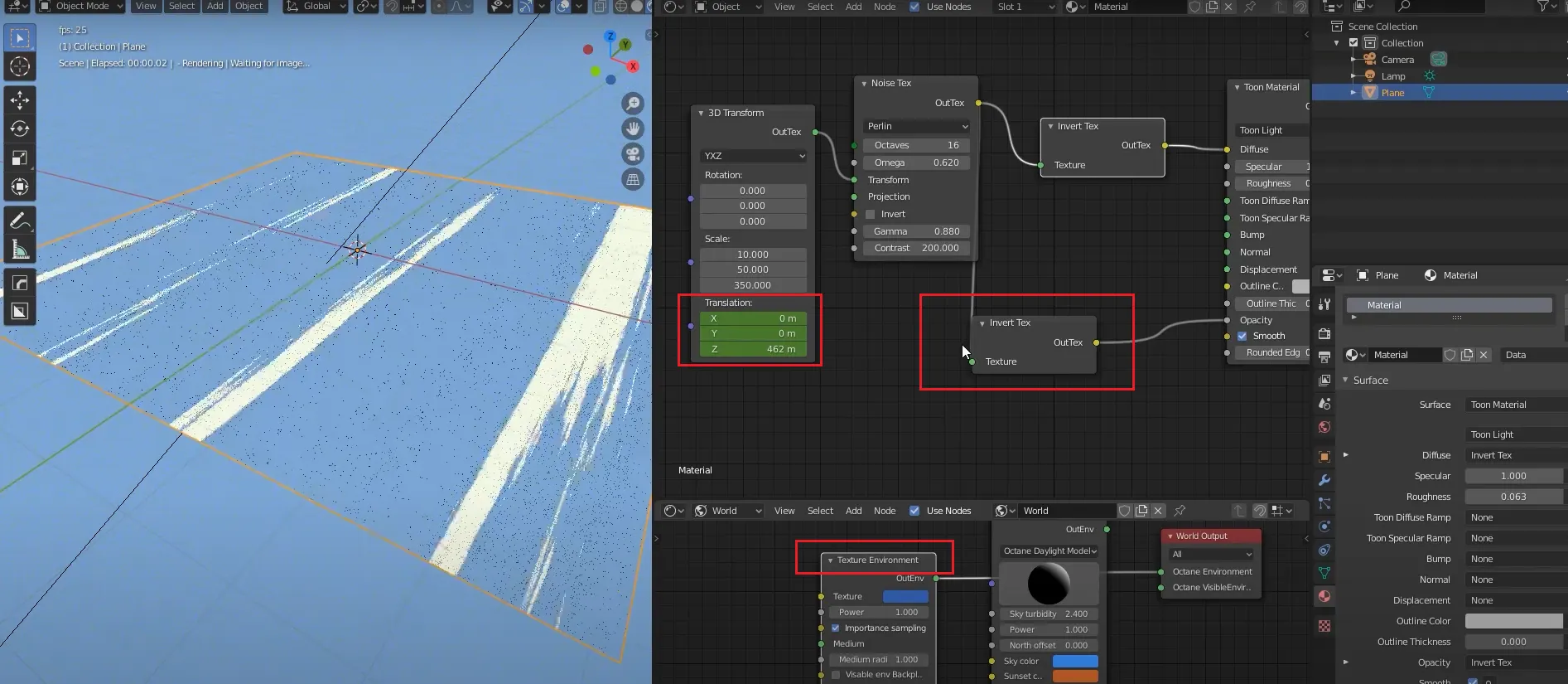 3D Transform에서 Translation의 z축으로 애니메이션을 주고 Noise Tex를 Invert Tex로 반전시킨다음 Toon Material의 Opacity에 넣어서 라인만 빼줍니다. 그리고 환경은 Octane의 Texture Environment를 통해서 World Output으로 빼줍니다.