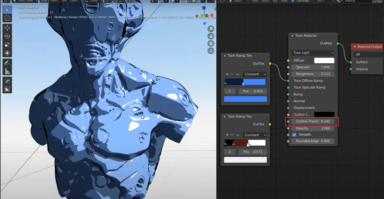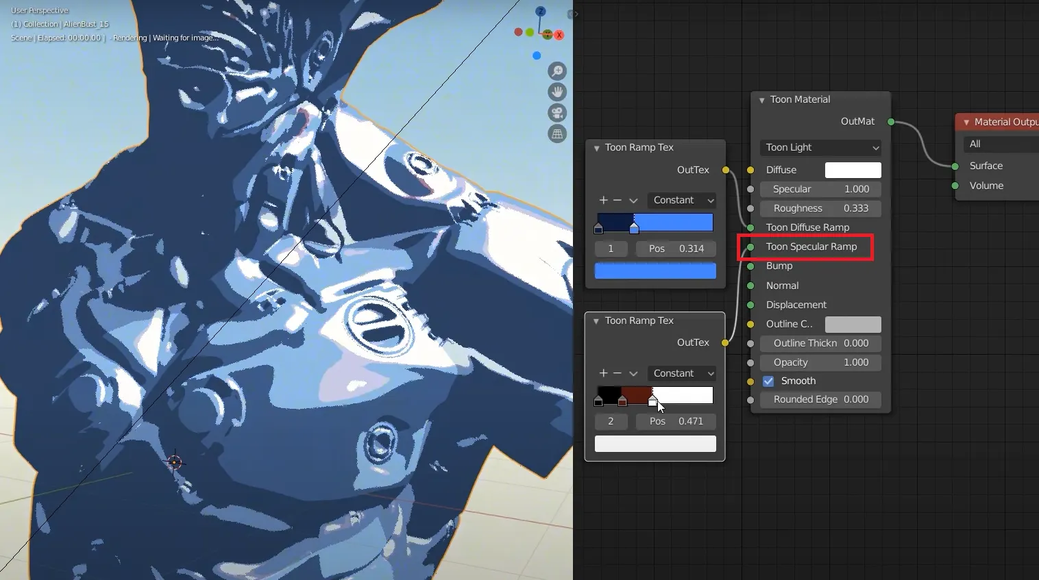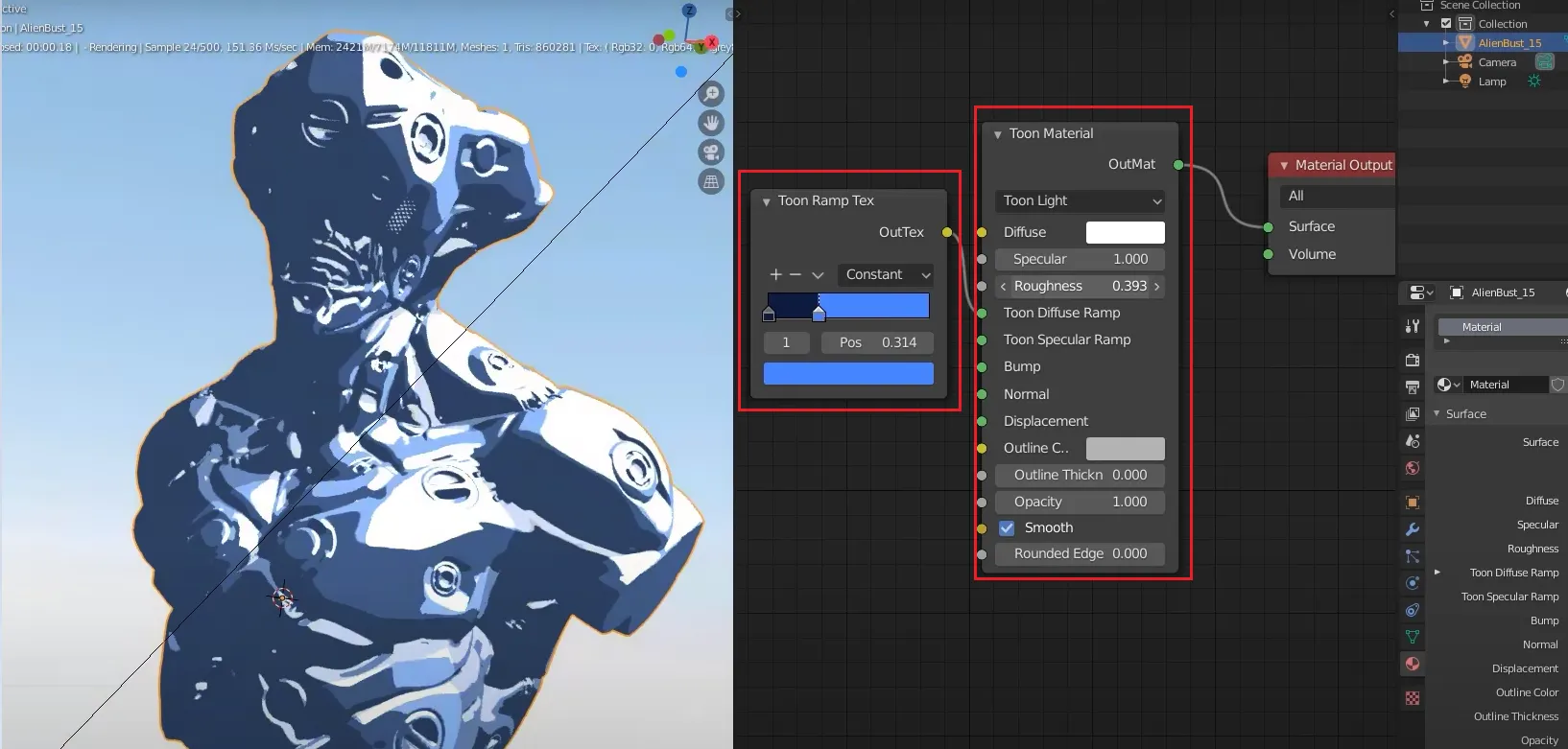 Octane에는 Toon Material이 따로 있고 블렌더의 RampColor와 유사한 Toon Ramp Tex가 있습니다.