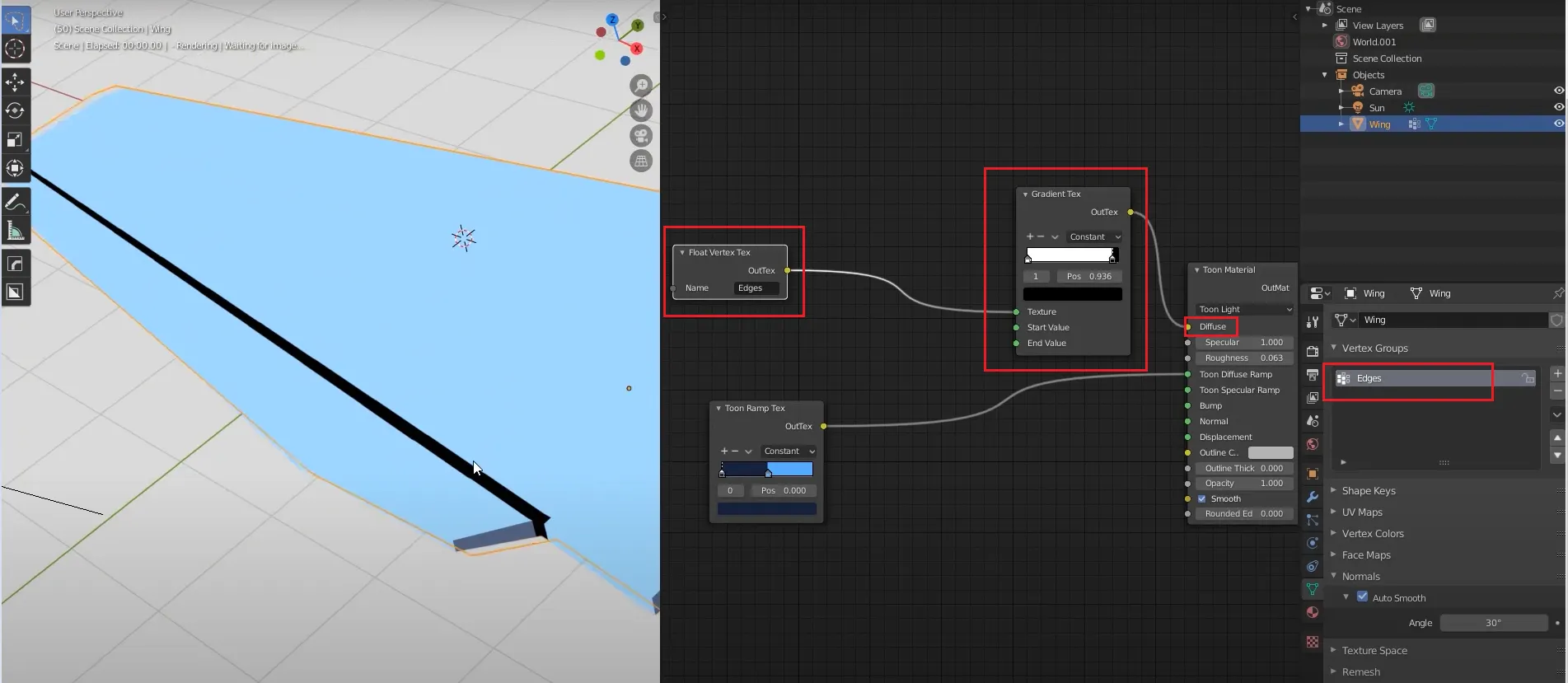 라인으로 만들고 싶은 엣지를 Vertex Group로 등록 시킨다음 Float Vertex Tex에서 해당 그룹을 등록하고 Gradient Tex를 통해서 라인으로 만들 수 있습니다. 이후 Diffuse에 등록하는데 Diffuse와 Toon Diffuse Ramp가 별도로 되어있는것이 주목할만합니다.