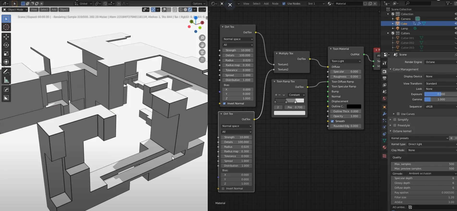 Octane에서 각진면들의 선화 표현도 Dirt Tex를 통해서 묘사합니다. Dirt Tex의 하나는 Invert Normal을 활성화 하고 나머지와 Multiply를 해주면 표현이 됩니다.