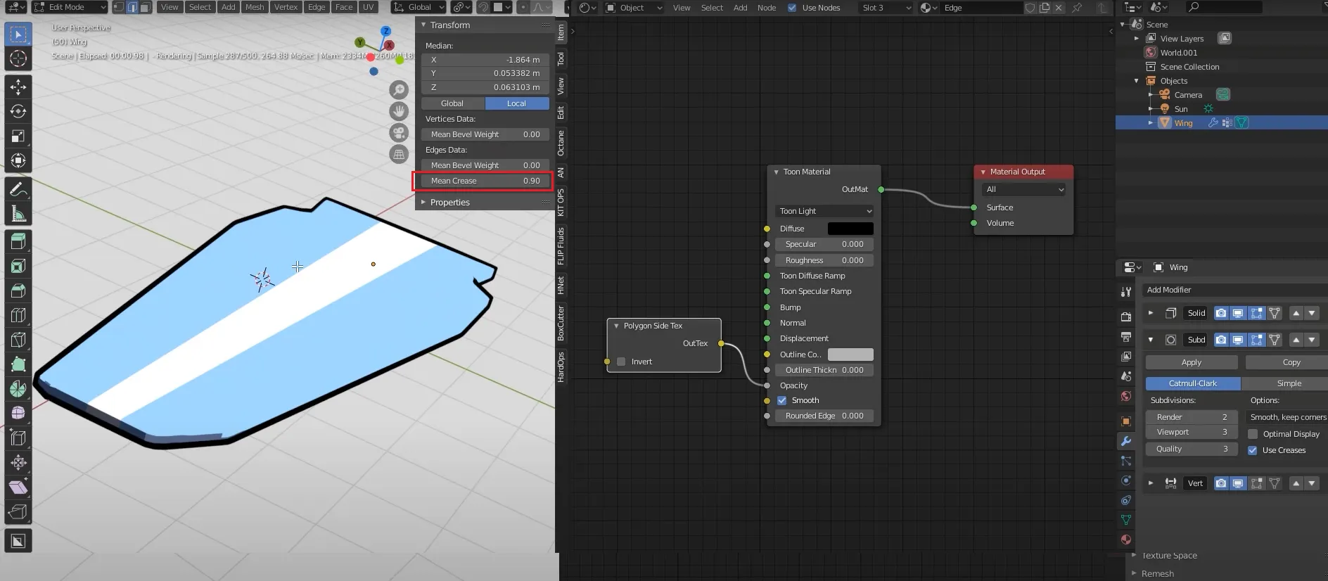 에디트 모드에서 Item판넬의 하단에 Mean Crease 를 증가시킬 수 있습니다. NPR에서 메쉬의 밀도가 필수인데 로우폴리곤에 subdivision smooth를 주면 엣지들이 부드러워집니다. 그래서 Shift + G등으로 Crease를 주는데 Item패널에서 쉽게 할 수 있습니다.