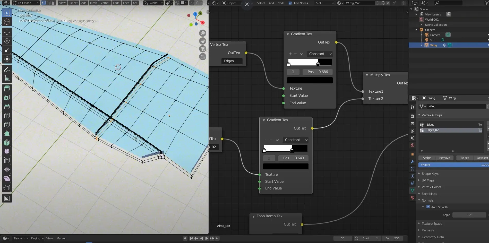 복수의 버텍스 그룹과 Vertex Tex, Gradient Tex등을 Multiply등으로 블렌딩해서 사용할 수 있다.