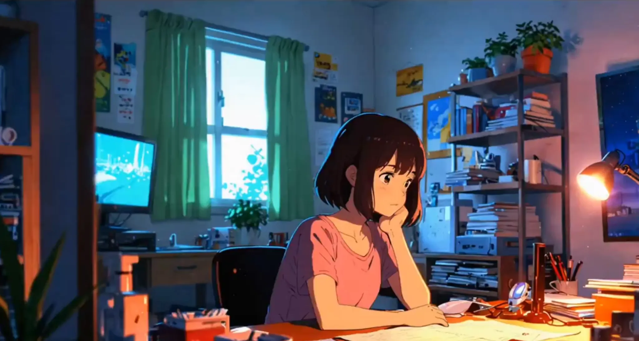 lofi animation of a girl be absent-minded in front of a desk.