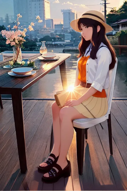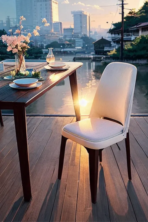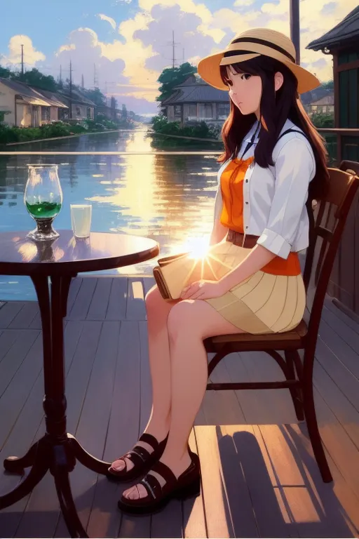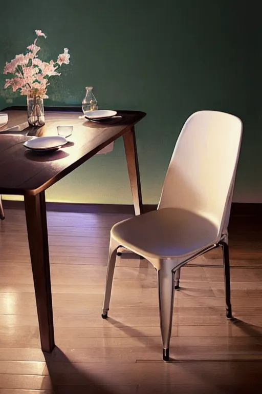 _modelshoot style, (extremely detailed CG unity 8k wallpaper), full shot body photo of the most beautiful artwork in the world, table, chair, cup, drinking_glass, John Constable, Ed Blinkey, Atey Ghailan, Studio Ghibli, by Jeremy Mann, Greg Manchess, Antonio Moro, trending on ArtStation, trending on CGSociety, Intricate, High Detail, dramatic, makoto shinkai kyoto, trending on artstation